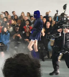 Neben den Nebelschwaden, aus denen die Models auftauchten, wurden die Kopfbedeckungen zu einem Hingucker. Die Kreationen aus ineinander geschlungenen Gürteln erinnerten ein wenig an eine Geißelung – oder eben eine typische Kopfbedeckung aus der SM-Szene.