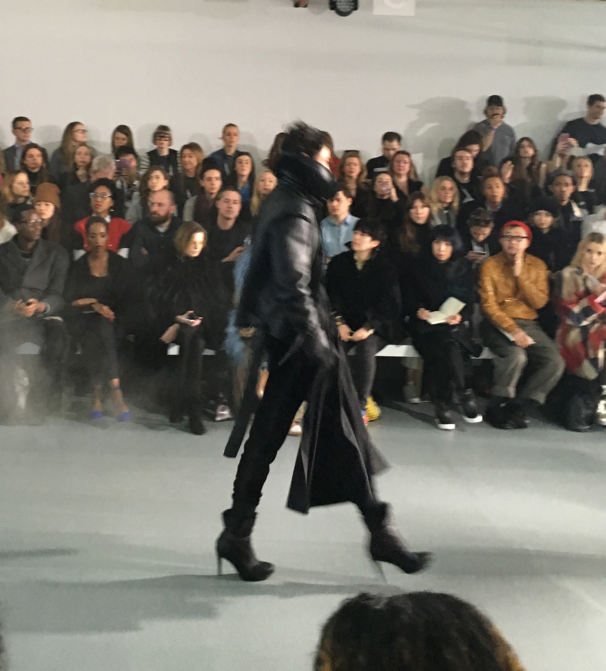 Neben den Nebelschwaden, aus denen die Models auftauchten, wurden die Kopfbedeckungen zu einem Hingucker. Die Kreationen aus ineinander geschlungenen Gürteln erinnerten ein wenig an eine Geißelung – oder eben eine typische Kopfbedeckung aus der SM-Szene.