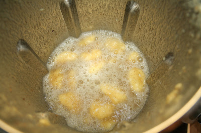 Den geschälten und gehackten Ingwer zusammen mit dem Fruchtfleisch vom Apfel (ohne Kerne und Schale) und den geschälten und geschnittenen Kiwis, sowie den gepressten Saft von der Grapefruit und der Limette in die Kanne geben. Je nach Belieben kaltes oder warmes Wasser bis zwischen beide Markierungen einfüllen. Programm 5 zum Pürieren ohne Erwärmung wählen. Dauer: 5 Minuten.