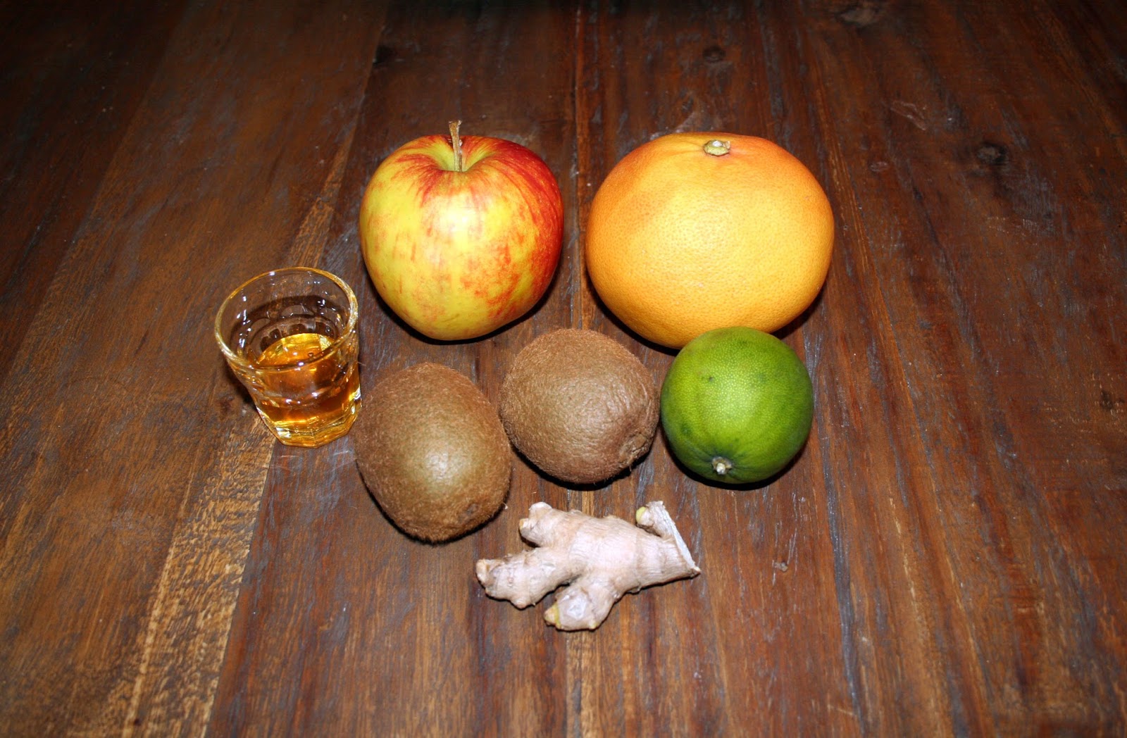 Den geschälten und gehackten Ingwer zusammen mit dem Fruchtfleisch vom Apfel (ohne Kerne und Schale) und den geschälten und geschnittenen Kiwis, sowie den gepressten Saft von der Grapefruit und der Limette in die Kanne geben. Je nach Belieben kaltes oder warmes Wasser bis zwischen beide Markierungen einfüllen. Programm 5 zum Pürieren ohne Erwärmung wählen. Dauer: 5 Minuten.
