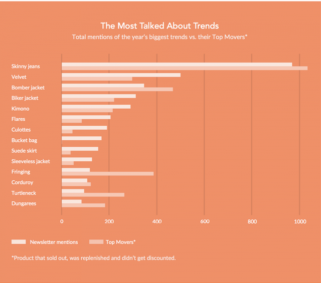 Auf dem 2. Platz der meistverkauften Modetrends (Top Movers) im Jahr 2015 befinden sich übrigens die Bomberjacken, gefolgt von den Trend Fransen, Samt und Rollkragenmodellen. Und hier kommt die gesamte Auflistung: