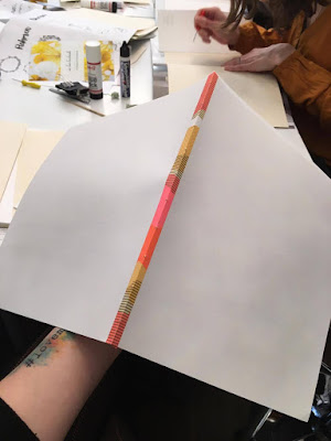 Nun geht es auch schon zum Binden: Mittels einer Schablone werden die Löcher, durch die später der Faden muss, in die einzelnen Lagen gestochen.