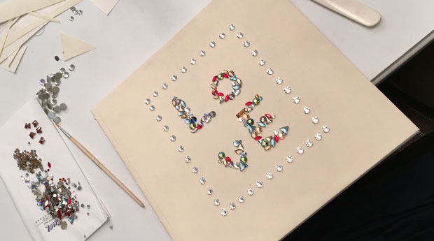 Jetzt geht es ans Verzieren. Das Buch kann individuell bemalt oder mit Swarovski-Steinen dekoriert werden. Die Kristalle werden dabei übrigens mit Schmucksteinkleber angebracht und halten garantiert Jahre!