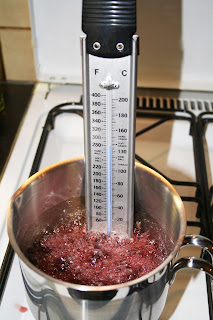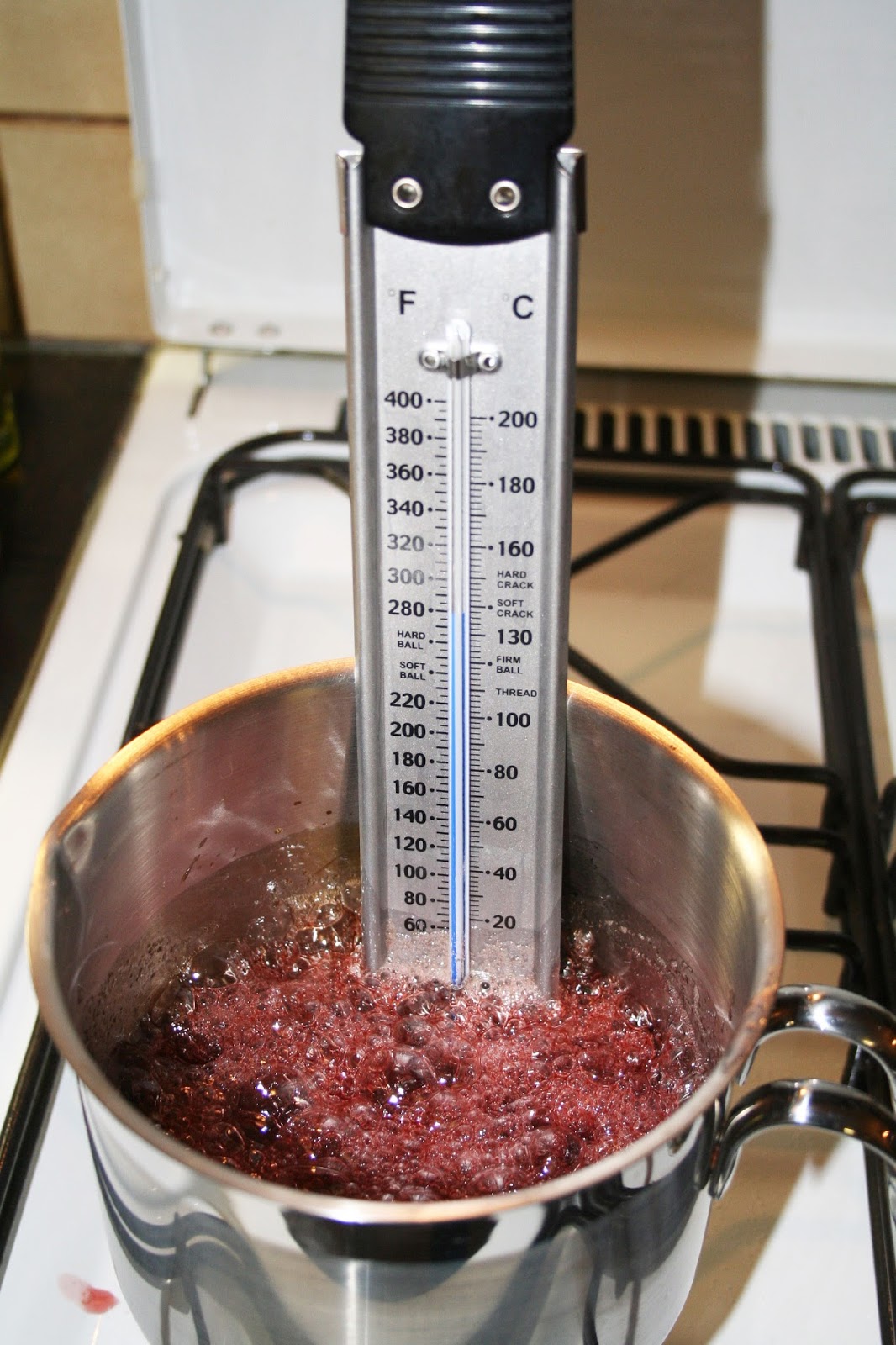 Den Saft und den Zucker in einem Topf zum Kochen bringen. Die Masse umrühren bis sich der Zucker aufgelöst hat, dann mit dem Zuckerthermometer die Temperatur beobachten. Die süße Mischung sollte nicht heißer als 150 °C werden (ab hier brennt der Zucker sehr schnell an), aber auch nicht kühler als °C (sonst werden die Herzen nicht hart).