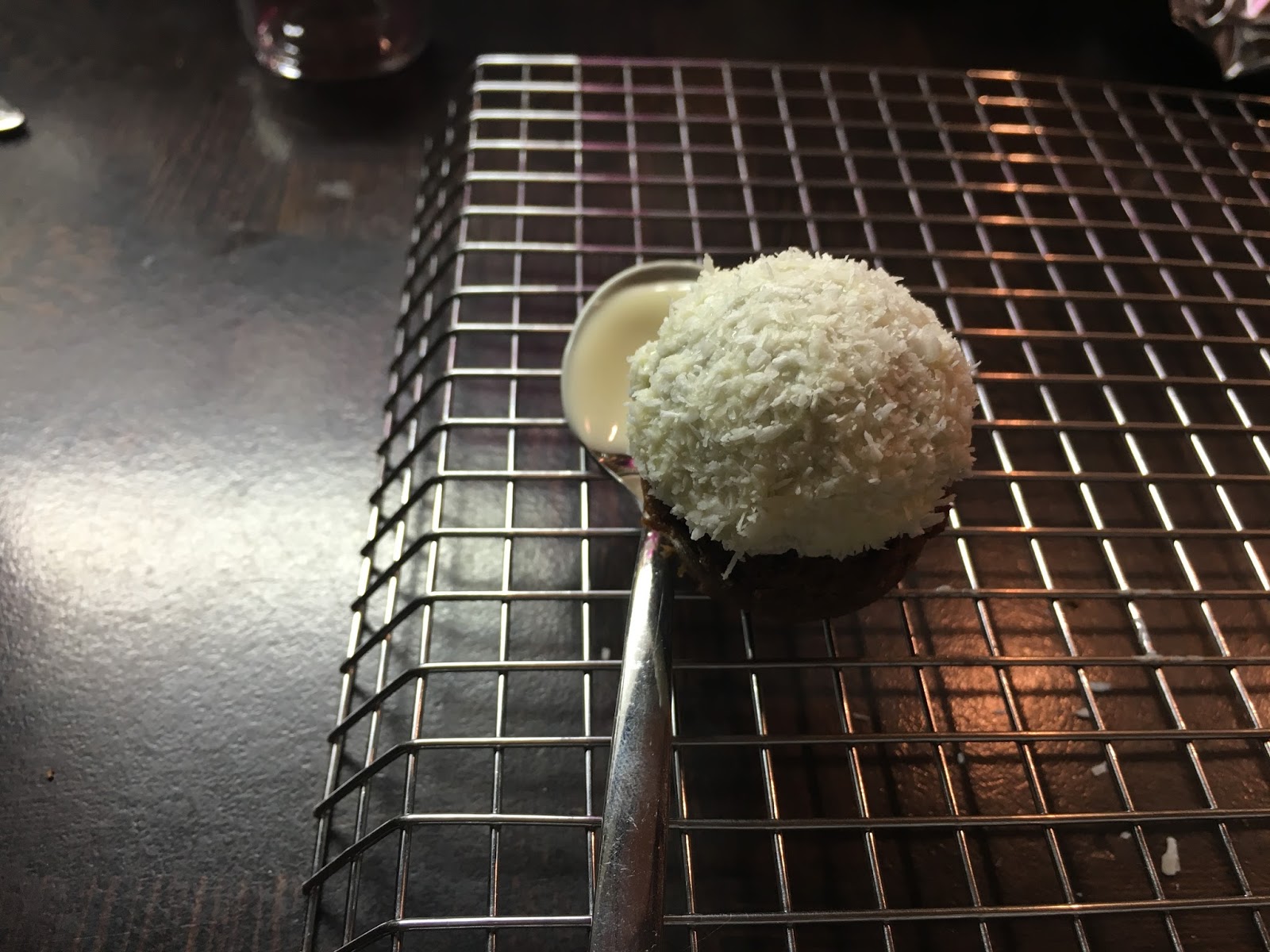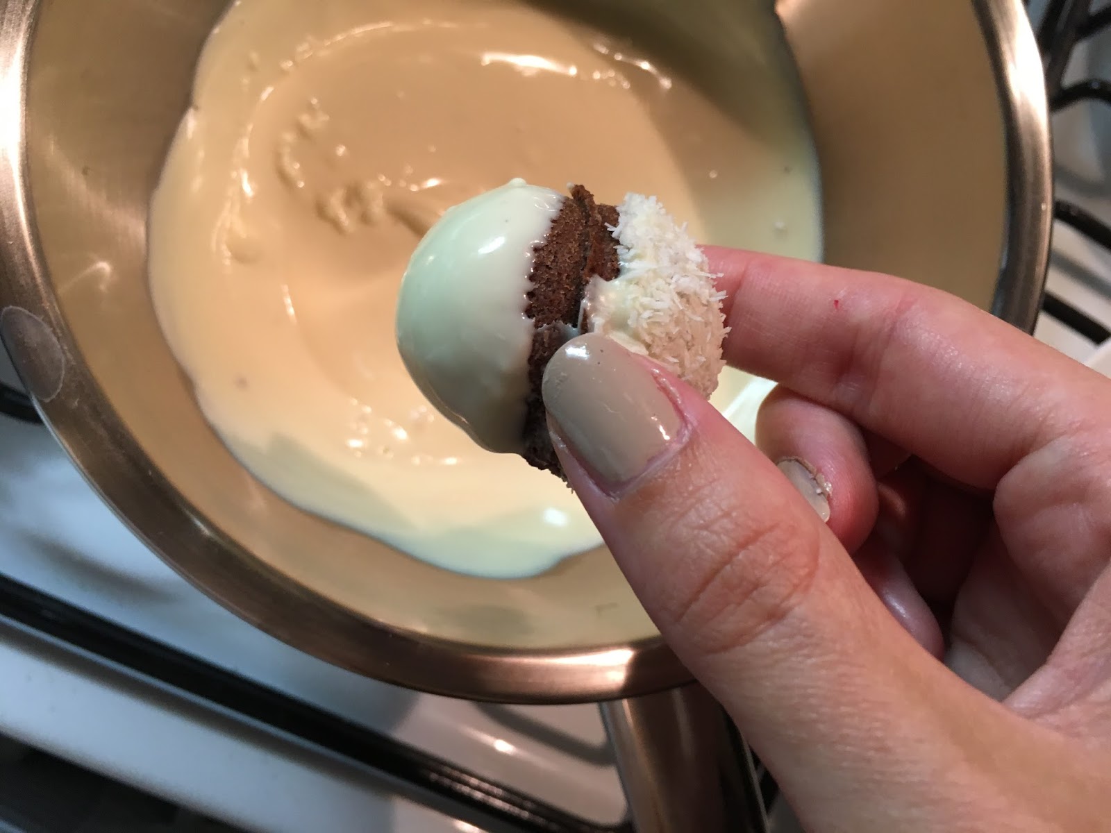 Sind die Kugeln ausgekühlt, die weiße Kuvertüre im Wasserbad schmelzen. Ist die Schokolade schön flüssig, eine Kugel bis etwa 3 Millimeter vor der Hälfte eintauchen und diesen Teil sofort in die Kokosflocken tunken. Die Flocken halten nur solange die Schokolade noch nicht trocken und ausgehärtet ist.