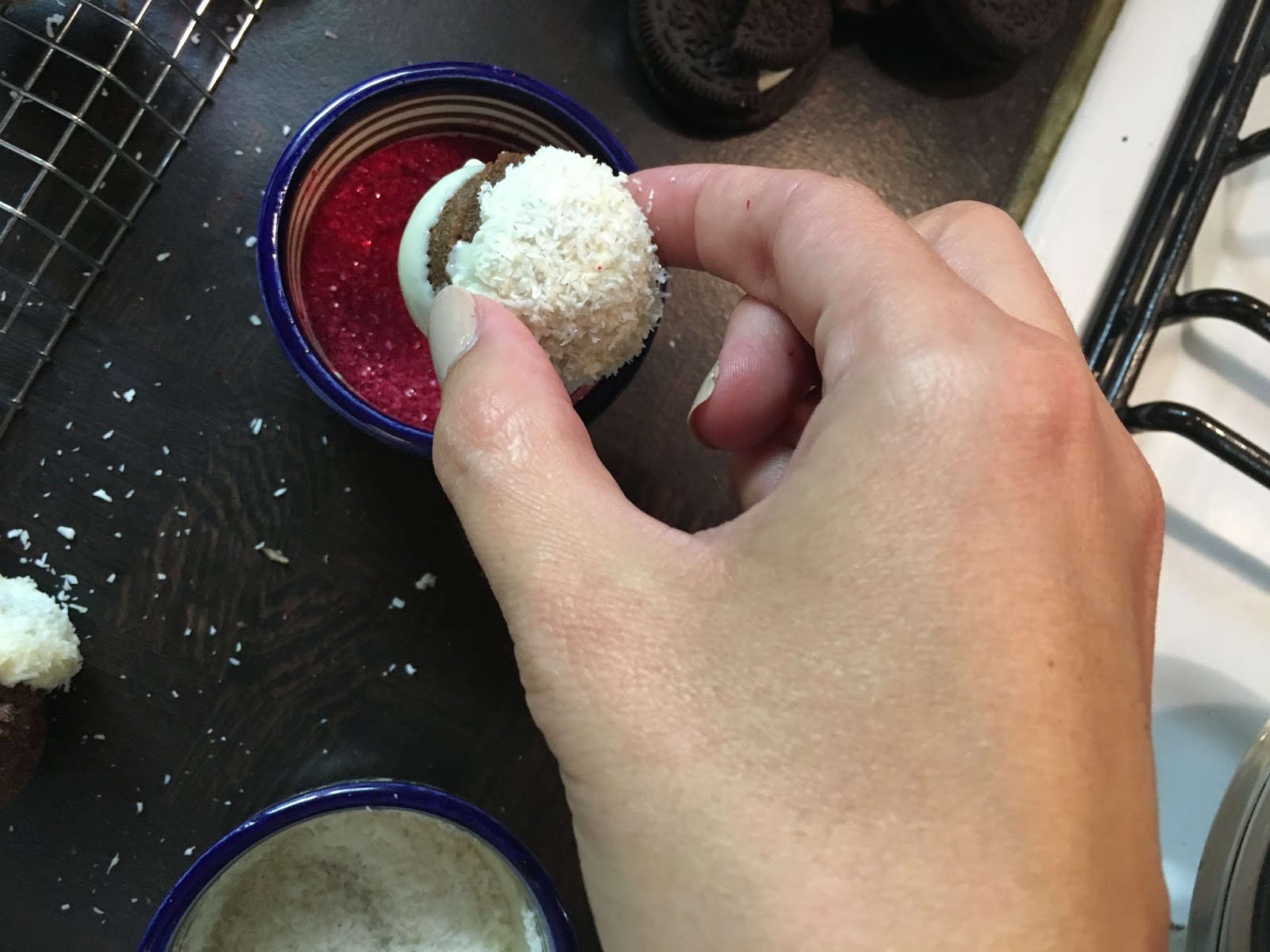Diese ebenfalls nicht ganz bis zu Hälfte in die im Wasserbad geschmolzene weiße Kuvertüre tunken und anschließen in Kokosflocken tauchen. Trocknen lassen.