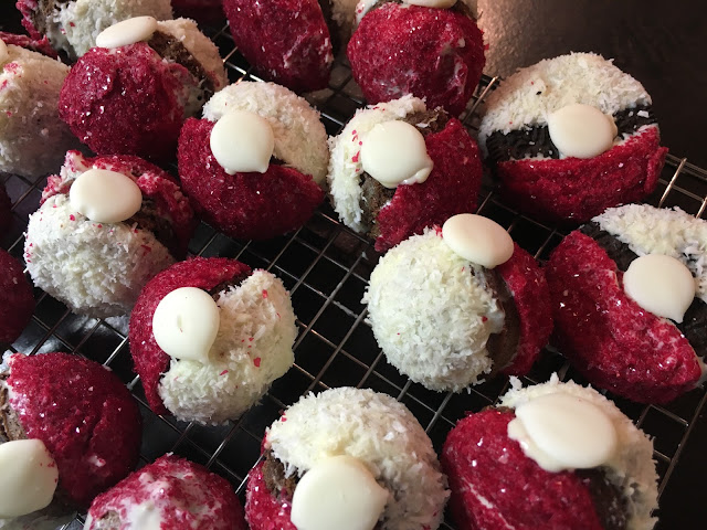 Ich habe dazu einfach weiße Schokoladedrops (Cake Melts von Birkmann aus dem Supermarkt) verwendet. Auf deren Rückseite ein wenig Kuvertüre als Klebemittel verteilen und und der Mitte zwischen der weißen und roten Hälfte positionieren.