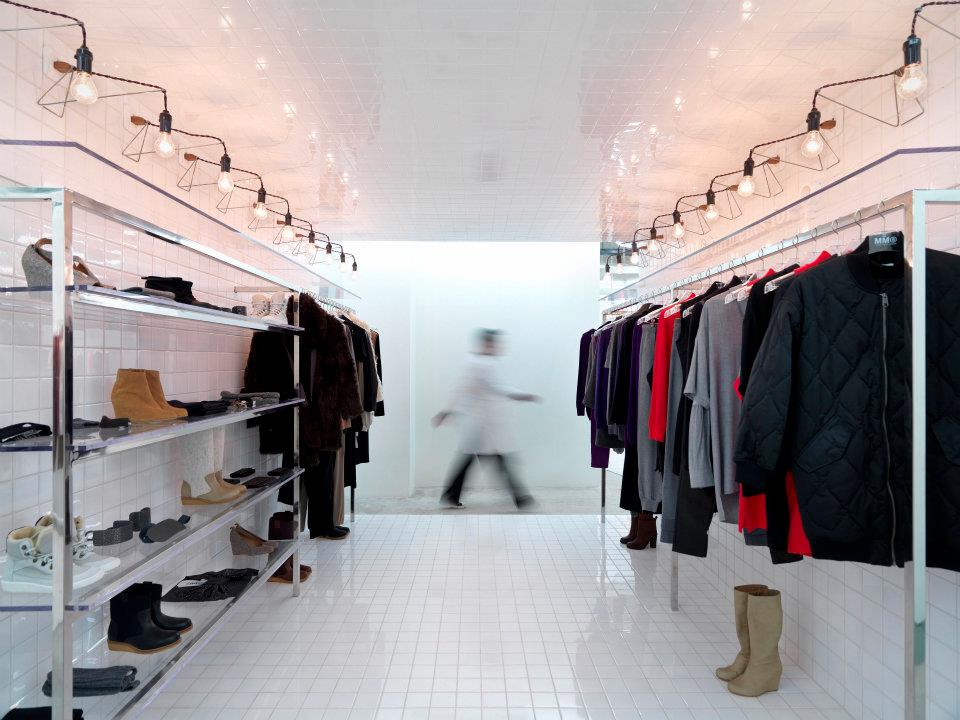 The same whitewashed, mirrored interior like at other stores, but it’s the largest to date: Divided in cubes the new Maison Martin Margiela store in Bejings Sanlitun Village measures 540 square feet with hexagonal fluorescent tubes on the ceiling. Special detail: The silver slide from the first floor to downstairs.