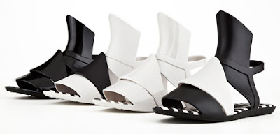 If the British designer Gareth Pugh and the Brazilian footwear label Melissa cooperate, the outcomes are sandals and flats, which look like sculptures – but very comfortable sculptures. „The idea for the sandal was taken from the vented outfits produced for my first show in Paris – these formed an exoskeleton,“ said Pugh to style.com. „The Melissa style has quite an amour-like quality to it, which I love, but essentially they’re an open work sandal, nothing as weighty or as cumbersome as armor.“