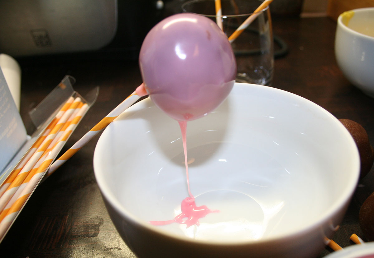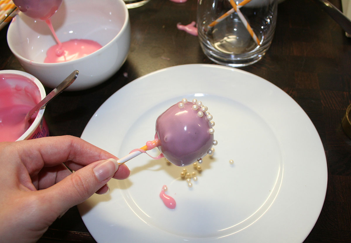 Diese einfach auf Cake-Pop-Sticks aufspießen und in fertige Punschglasur eintauchen.