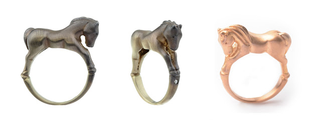 I want to wear my rocking horse – possible with the „my little pony“-ring by Oliver Heemeyer. The yellow gold or white gold black rhodium-plated jewel brings back childhood memories.