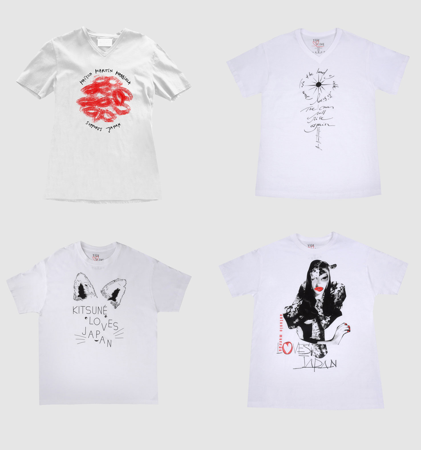Der Onlineshop yoox.com hat sich mit acht internationalen Designerlabels verbündet, um in Form einer besonderen T-Shirt-Kollektion gemeinsam ihre Solidarität mit Japan zum Ausdruck zu bringen. So schickt, neben Antonio Marras, Dsquared2, Kitsuné, Maison Martin Margiela, Marni Moschino und Y-3, Martin Margiela viele Küsse in das Katastrophen-Gebiet und Ann Demeulemeester schenkt dem Land der aufgehenden Sonne mit eben dieser Hoffnung.