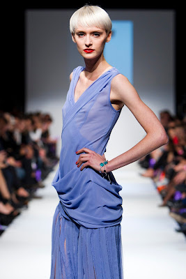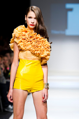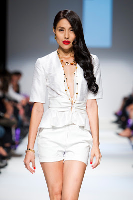 Designer Marcos Valenzuela gives up the black and very dark sexy side and presented colourful and white leather and silk creations: